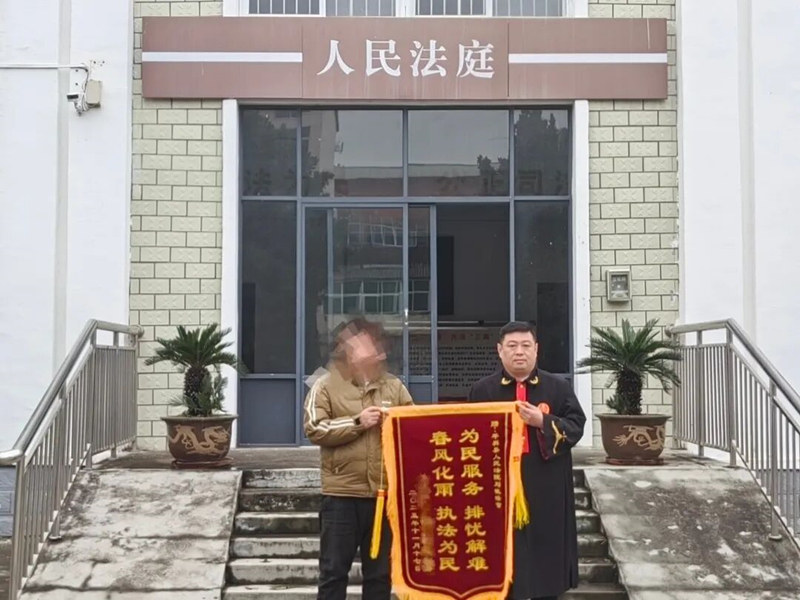 事后,杨某专程赶来平舆法院,将一面写有“为民服务,排忧解难,春风化雨,执法为民”的锦旗送到刘晓法官手中。