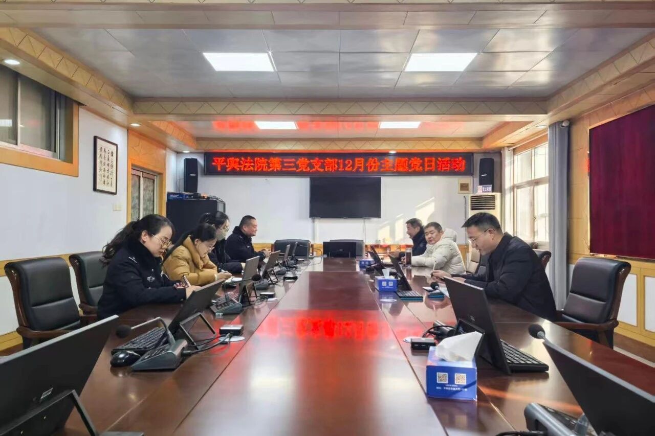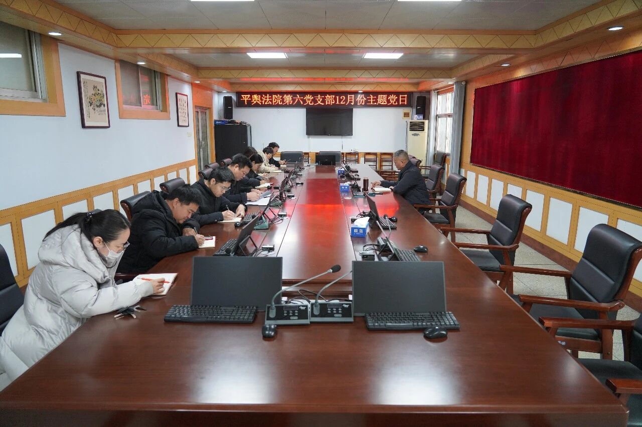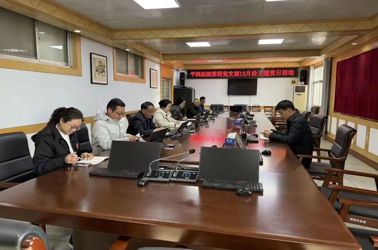 12月25日,平舆县人民法院以党支部为单位开展主题党日活动,通过学习贯彻二十届四中全会精神、深入领会党的创新理论、学习英模先进事迹,教育引导全体干警强化理论武装、践行履职担当。